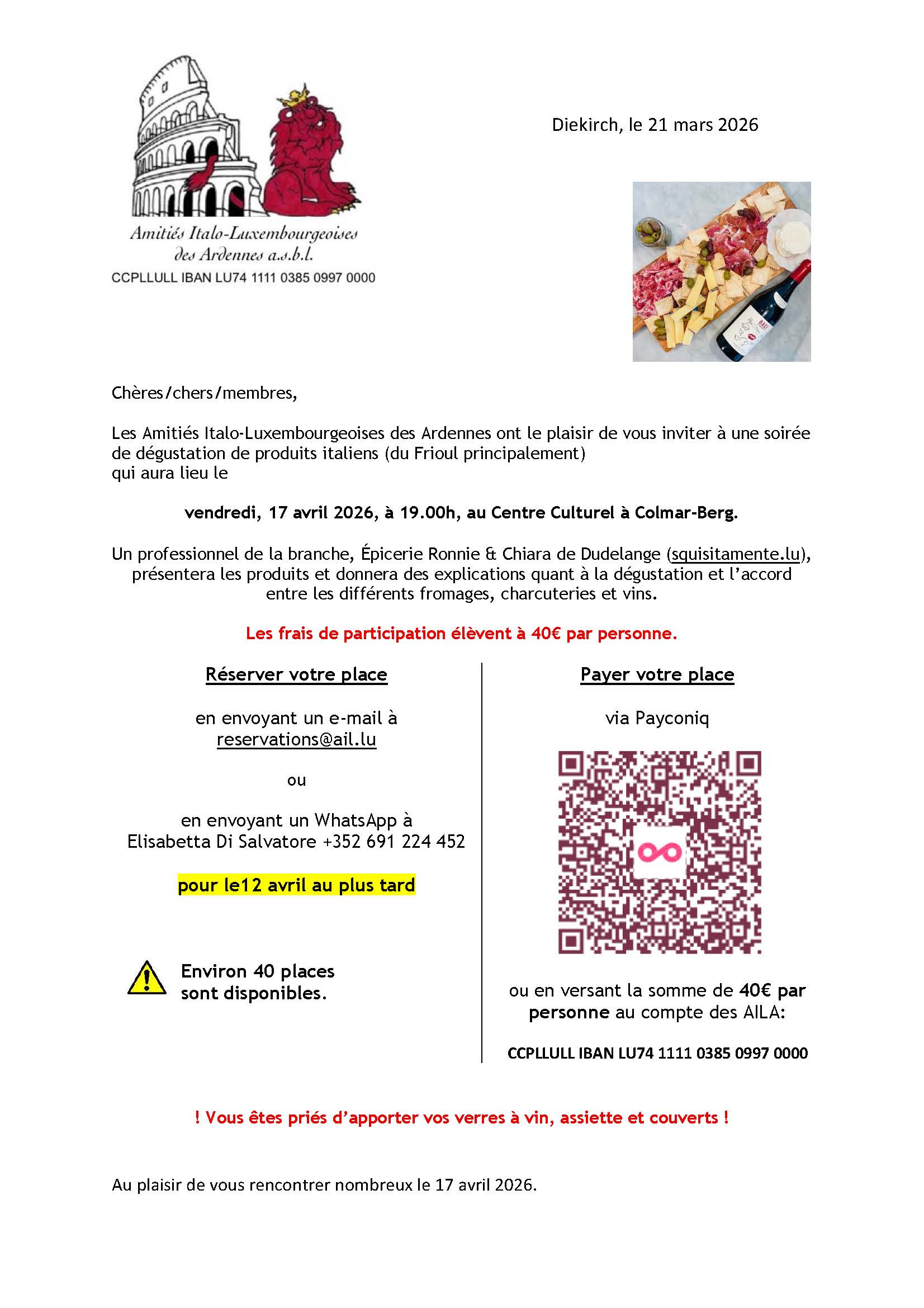 En vue des conditions météorologiques défavorables annoncées pour demain en fin de journée, le Conseil d’Administration des Amitiés Italo-Luxembourgeoises des Ardennes a décidé d’ annuler et de reporter la soirée Tombola du 7 janvier 2026.