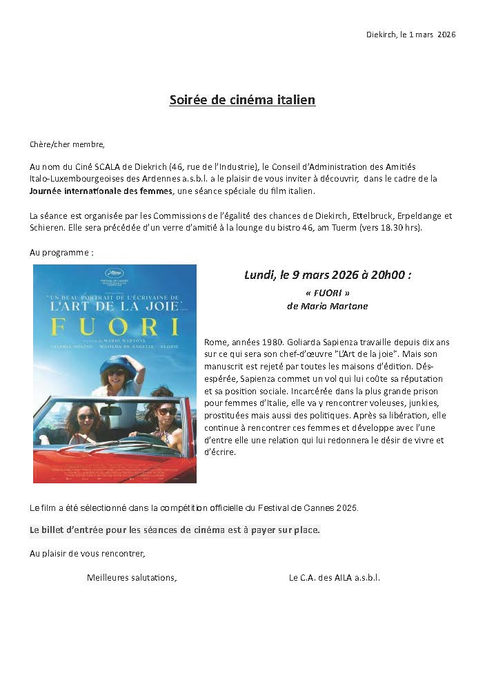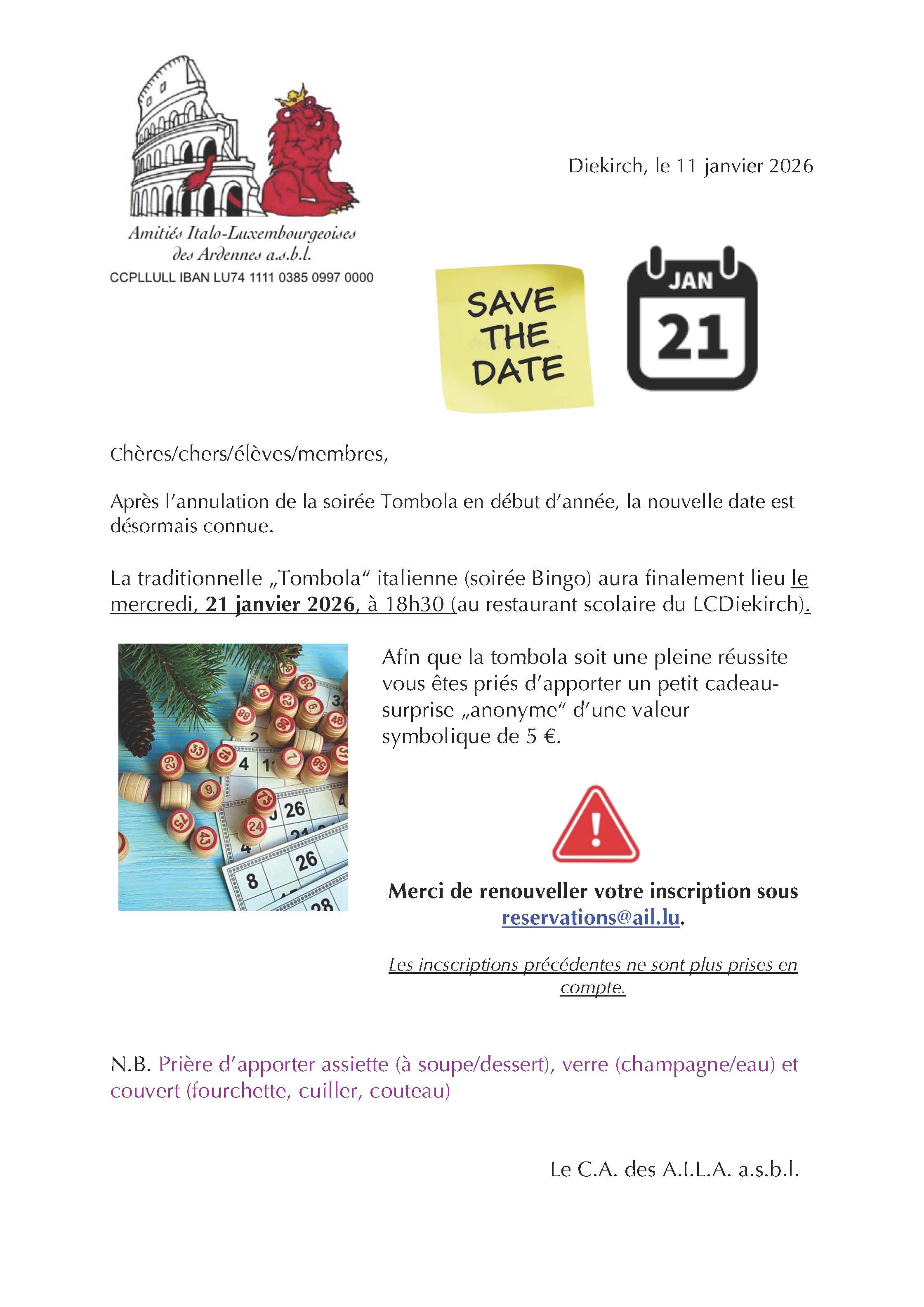 En vue des conditions météorologiques défavorables annoncées pour demain en fin de journée, le Conseil d’Administration des Amitiés Italo-Luxembourgeoises des Ardennes a décidé d’ annuler et de reporter la soirée Tombola du 7 janvier 2026.